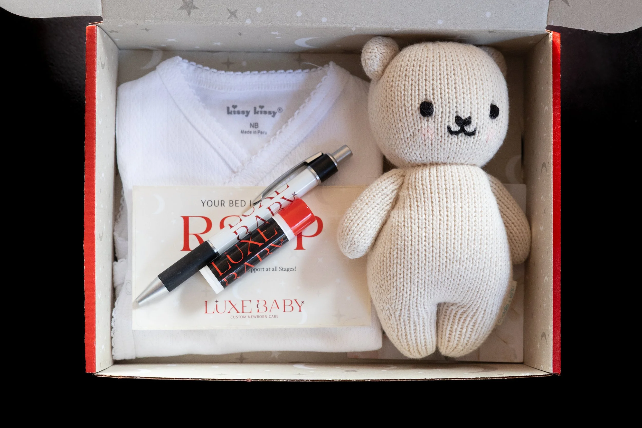 Every gift card purchase arrives with our signature Luxe Baby gift box, curated with premium items to welcome parents into this new chapter. Inside, they’ll find a Kissy Kissy newborn onesie, a Cuddle + Kind baby, and a few branded items. Each box is finished with a handwritten note detailing the services they’ve been gifted and your personal message, creating a heartfelt opening that helps them feel supported from the very start.